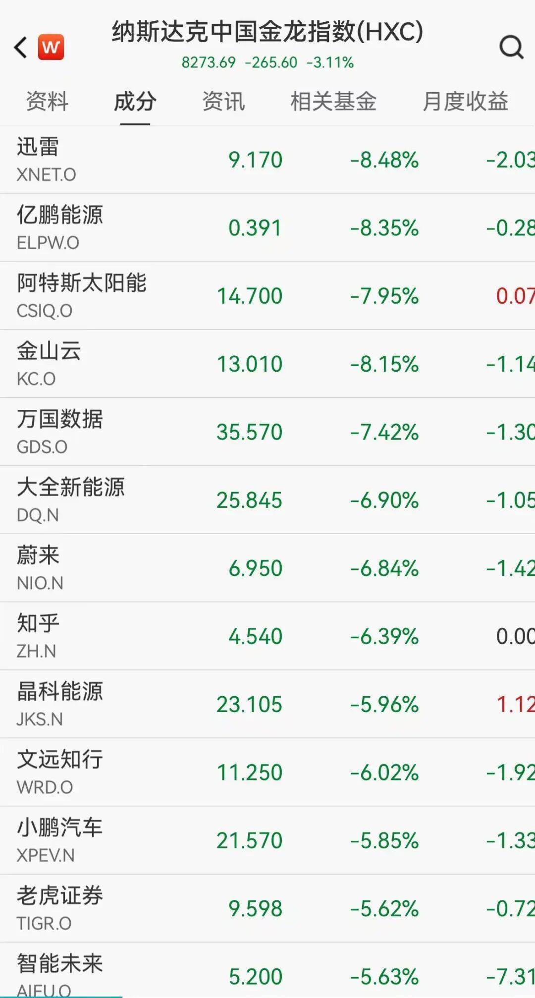 中概股方面,纳斯达克中国金龙指数跌超3%,多只热门中概股走低。