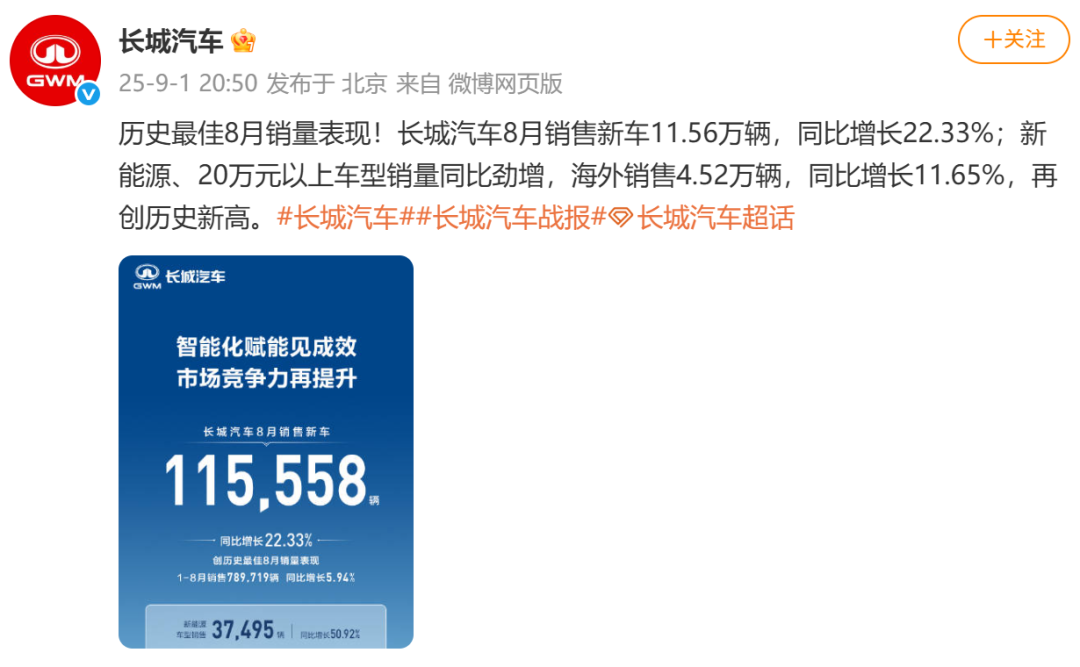 9月1日,长城汽车对外发布2025年8月以及1-8月产销快报。数据显示,8月长城汽车销量为11.56万辆,同比增长22.33%,其中新能源车销量为3.75万辆。今年1-8月,长城汽车累计销量为78.97万辆,同比增长5.94%,其中新能源车销量为23.25万辆。