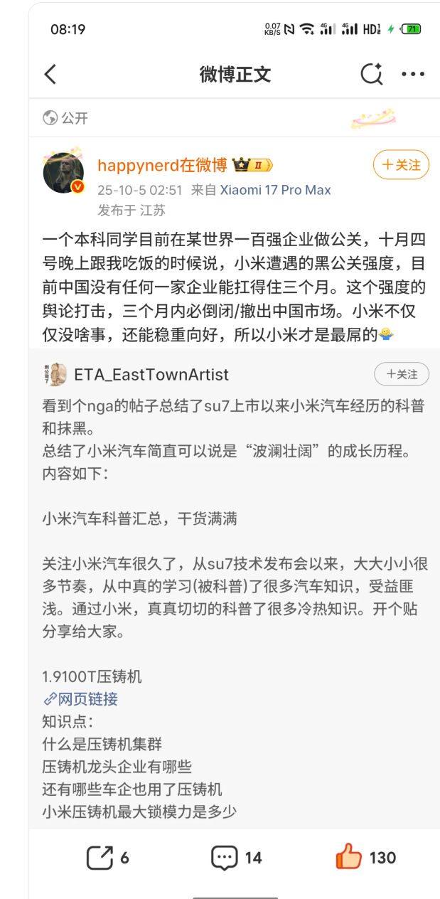 值得关注的是,网友对小米汽车的态度也在逐渐走向理性。有观点指出“现在网友不再轻易被极端舆论影响,销量才不会受太大冲击”,大家开始学会区分“真实问题”和“恶意抹黑”:对于客服态度、软件bug等实际问题,会客观反馈期待改进;但对于无依据的“倒闭传言”“技术造假”等抹黑,则会主动反驳。这种理性氛围,既让小米汽车有压力去优化产品和服务,也为其创造了更健康的成长环境。
